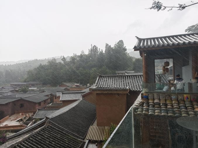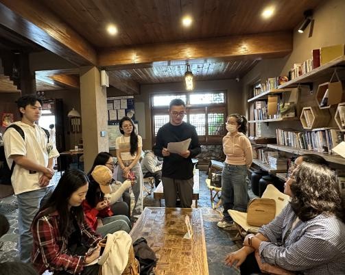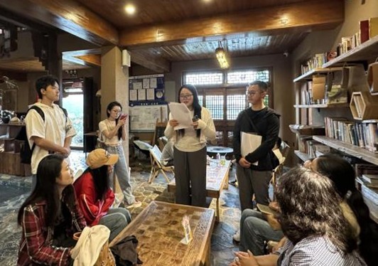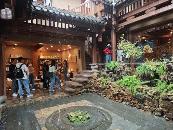 交流结束后,大家实地参观了“乐居之眼”旅居图书馆。这座图书馆巧妙保留传统“一颗印”民居格局,在四周青瓦土墙的窗棂间,精心打造出集阅读、借阅、藏书与交流于一体的文化空间。雨帘从四水归堂的天井垂落,更添几分静谧,阵阵书香萦绕其间。置身于此,青年理论学习组成员们更真切体会到旅居图书馆是如何将公共文化服务延伸至旅游场景,通过“旅居+书香”的融合,让游客沉浸式体验“有一种叫云南的生活”的独特魅力。
