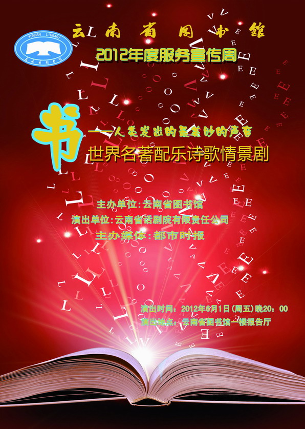 本周五晚,“书 ——人类发出的最美妙的声音·世界名著配乐诗歌情景剧”将在云南省图书馆一楼报告厅上演,观众将在欣赏音乐和舞蹈之际“听”到诸多中外名著精华。作为省图主办的年度宣传周主题活动之一,此次活动由云南省图书馆主办,由都市时报担任媒体主办,且是云南省话剧院改制为云南省话剧院有限责任公司后的首场演出。本报将赠送出150张演出票,除春蕾班和荣华学校的孩子们外,今天通过微博@都市时报索票的前十名热心读者也能获得入场券哦。