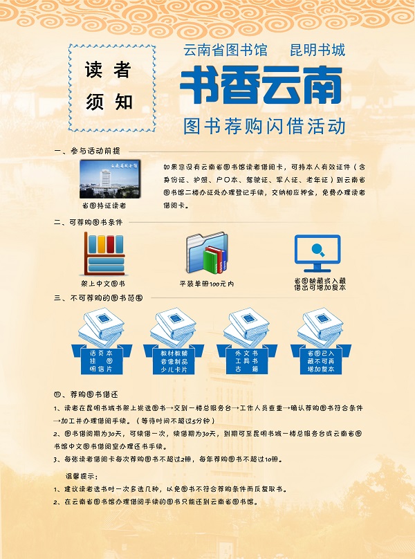 云南省图书馆图书荐购闪借活动读者须知 来源: 发布时间:2016-10-19 16:29:38 浏览次数: 次 【字体:小 大】 10月24日,云南省图书馆与新华书店昆明书城合作举办的“书香云南”图书荐购闪借活动将正式开启。 “我”可以参加吗?哪些书可以闪借?怎么借?一张图帮您轻松搞定: 活动地点:新华书店昆明书城(南屏街56号) 咨询电话:云南省图书馆0871-65413853 昆明书城0871-63648997 分享到: 【打印正文】