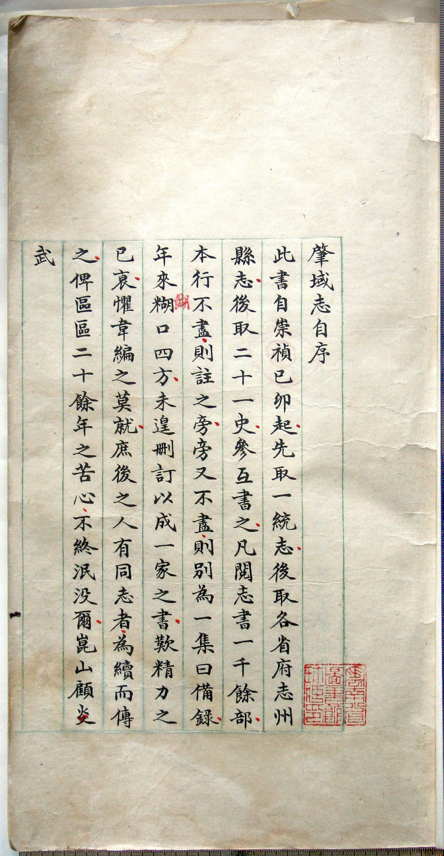 顾炎武,原名绛,字忠清,明亡,改名炎武,字宁人。顾炎武是明末清初的著名学者,讲究经世致用之学,广泛涉猎于经学、史学、音韵学和地理学,著述宏富,成就卓然。所著明代全国地理总志《肇域志》,初稿完成以来从未梓行,仅有少数抄本流传于世。《肇域志》以引证宏博、兼收并蓄为特色,征引史料超过了《寰宇通志》和《明一统志》,摘引的明代及清初方志有不少今已失传,有的引书今仅存孤本或罕见本,有的引书的版本比现存本为佳,为我们了解明末清初的志书提供了极有价值的信息。 《肇域志》原稿本20册,于乾隆五十八年(1793)由许庆宗得到携至杭州,传凡四世。咸丰四年(1854),蒋寅昉曾委托他人据许家所藏稿本抄录,40册。后来出现的《肇域志》抄本,大多是从蒋氏抄本转抄而成。国内现存的《肇域志》全帙抄本,仅云南省图书馆、四川省图书馆和上海图书馆存有。上海图书馆的抄本是后人的整理本,失去了顾炎武稿本的原貌,而滇川两省图书馆的抄本抄工精细,字迹工整,比较完整地保留了原稿本的面貌,只是川本漫漶残缺过甚,而滇本则基本完好。 2008年3月入选国务院公布的第一批《国家珍贵古籍名录》。 |
